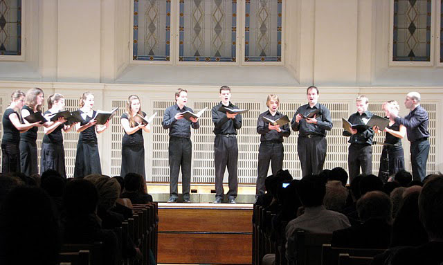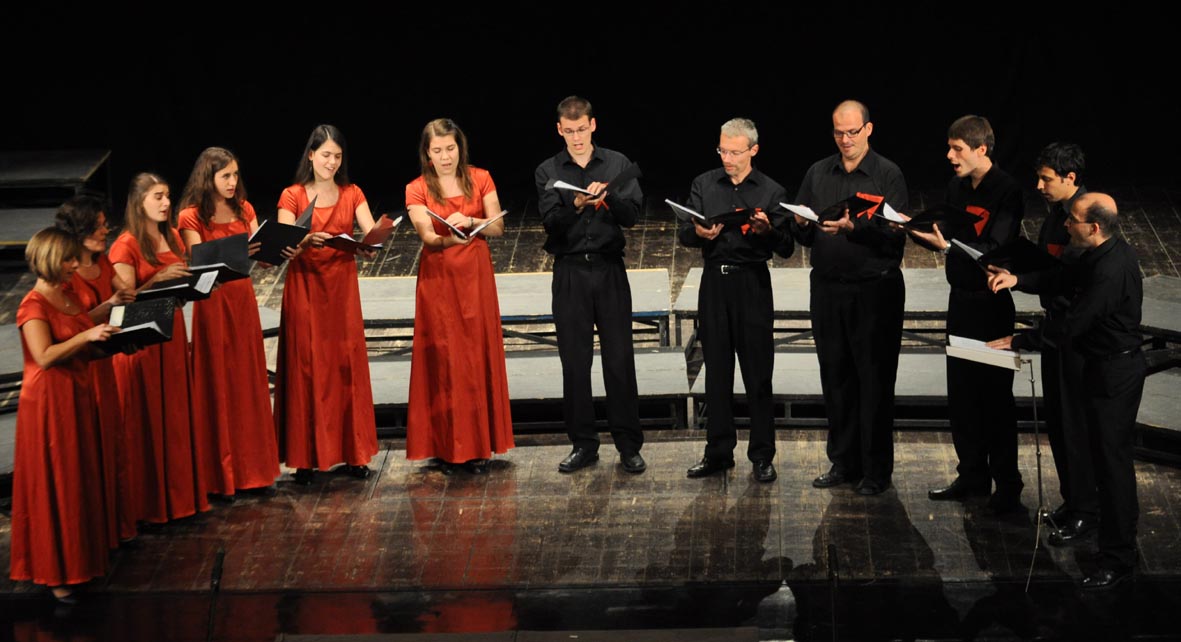 Sokféle különös sors című koncertünkön sokféle különös zene kerül terítékre, tizenkét szerző tizennégy izgalmas kompozíciója. Elhangzik például egy olyan Schubert-kánon, amelyben két tempóban egyidejűleg szólnak a szólamok; hallhatjuk a zenetörténet egyik leghajmeresztőbb zenéjét, Marenzio Petrarca-költeményre írt egyik madrigálját, és felcsendül Anton Bruckner zeneszerzői bravúrja, egy gyönyörű és fenséges motetta, amelyben egyetlen módosított hang sincs. Ősbemutatóként hangzik el a koncert címadó darabja, Szabó Barna finom szövésű alkotása, amely Arcadelt híres, Il bianco e dolce cigno kezdetű madrigáljának a szövegére íródott, nyáron elhunyt két tagunk, Busi Anna és Bácsi Zoltán László emlékére. Az őszi bőségtálon könnyedebb étkek is fogyasztásra kínáltatnak; ilyen például a 16. századi Peter Philips „dó, ré, mi, fá, szó, lá”-skálából építkező szellemes vallomása a zene hatalmáról – a szöveg írója egy bencés szerzetes –, valamint a svéd kortárs, Anders Edenroth jazzes-swinges show-darabja, amelynek témája az ízletesen elkészített chilis hús… (2010. november 5.) Részletes műsor ITT (PDF)