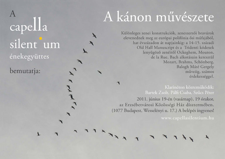 A Capella Silentium 2011. június 18-án a pázmándi Művelődési Házban, június 19-én pedig Budapesten, az Erzsébetvárosi Közösségi Házban, telt ház előtt mutatta be A kánon művészete című műsorát, mindkét helyszínen zajos sikert aratva. Köszönjük pázmándi és budapesti közönségünknek, hogy velünk tartottak az évszázadokat bebarangoló, izgalmas kalandtúrán, és részesültek abban az örömben, amelyet ezek a nagyszerű művek szereztek nekünk, előadóknak is. (2011. június 25.)
