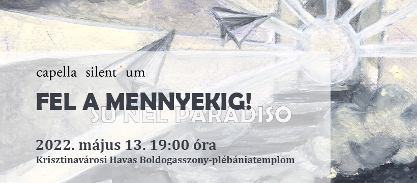 A Capella Silentium legújabb, Fel a mennyekig – Su nel paradiso című koncertjére invitáljuk Önöket a Krisztinavárosi Havas Boldogasszony-plébániatemplomba (Bp. I., Mészáros utca 1.), 2022. május 13-a, péntek 19 órára. A hangversenyen válogatott imádságokat hallhatnak 12 szerző tollából, közöttük Derecskei András: Evening Prayer című művének ősbemutatójával.