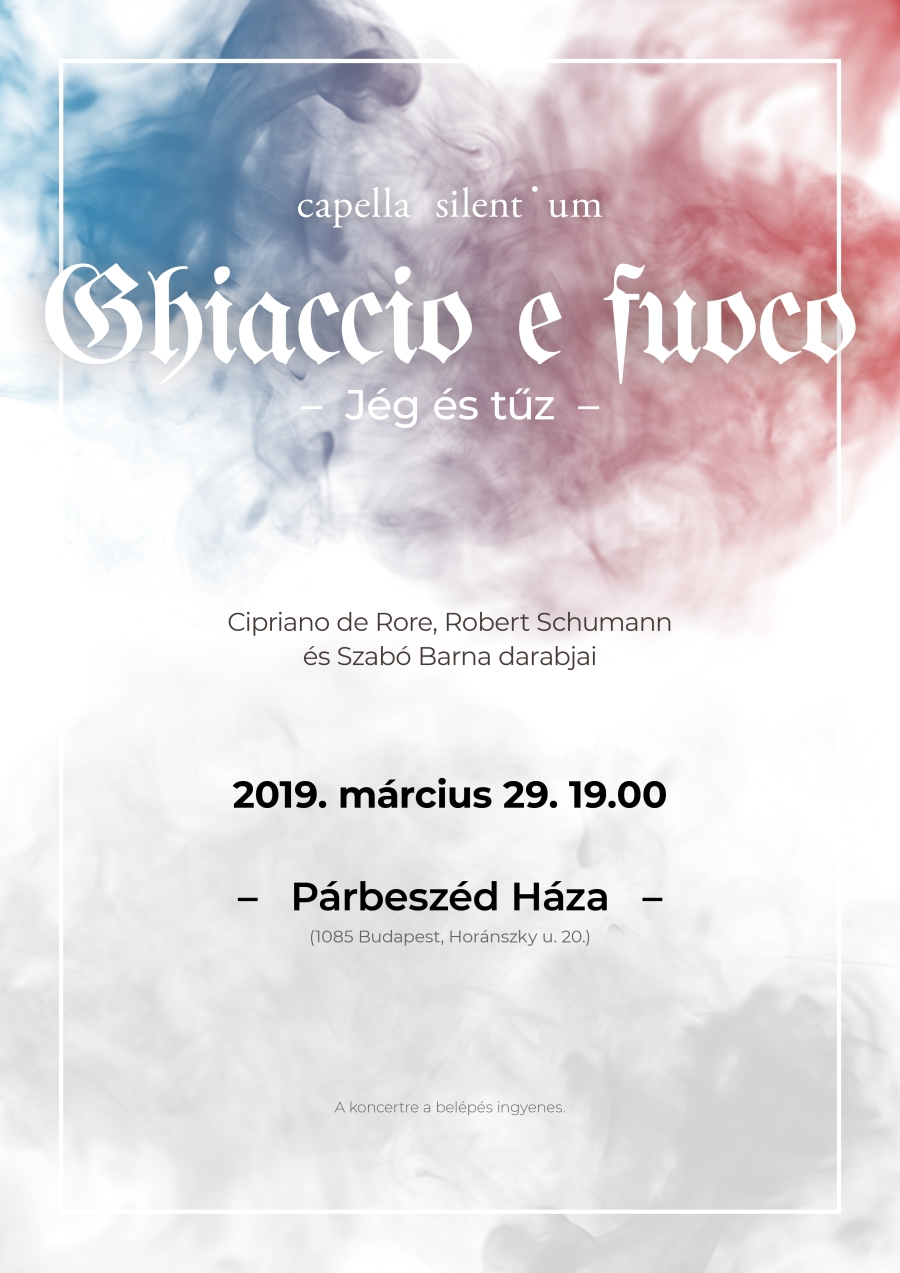 A Capella Silentium következő koncertjének gerincét a 16. századi Cipriano de Rore madrigáljai adják. Vágyódás, szenvedély, beteljesült és beteljesületlen szerelem kapcsolja Robert Schumann négyszólamú darabjaihoz, ezek mellett Szabó Barna (*1976) két bemutatója is elhangzik 2019. március 29-én 19 órakor a Párbeszéd Házában (Bp. VIII., Horánszky utca 20.). A részletes műismertető ide kattintva olvasható.