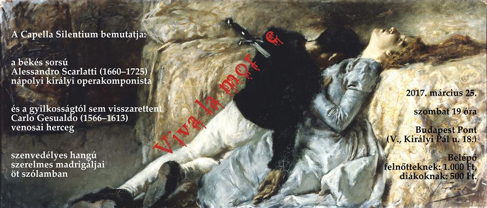 A Budapest Pontban (Királyi Pál u. 18.) 2017. március 25-én 19 órakor kezdődő koncertünkön a békés sorsú Alessandro Scarlatti (1660–1725) nápolyi királyi operakomponista és a gyilkosságtól sem visszarettent Carlo Gesualdo (1566–1613) venosai herceg szenvedélyes hangú szerelmes madrigáljai hallhatók öt szólamban. Belépő: felnőtteknek 1000 Ft, diákoknak 500 Ft. A részletes műismertető ide kattintva olvasható.