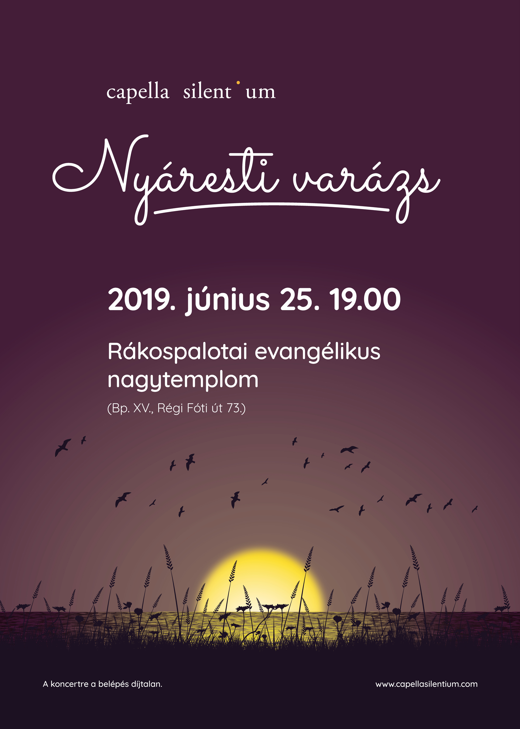 Július 12-én, szombaton, este 7 órakor, a sukorói református templomban, a Sukorói Zenei Nyár programsorozat keretében lép fel a Capella Silentium. A nyáresti tartalmas kikapcsolódás jegyében összeállított színes műsorban eddigi tematikus koncertjeink anyagából válogatunk. A négy blokk érdekessége, hogy szándékosan társítottunk olyan műveket, amelyek korban és stílusban távol állnak egymástól, ugyanakkor egy szerző vagy egy téma hangsúlyosan van jelen minden blokkban. Így került egymás mellé Marenzio és Piazzolla, Ives és Josquin, Brahms és Balogh. A belépés ingyenes. Részletes műsor és ismertető innen letölthető.