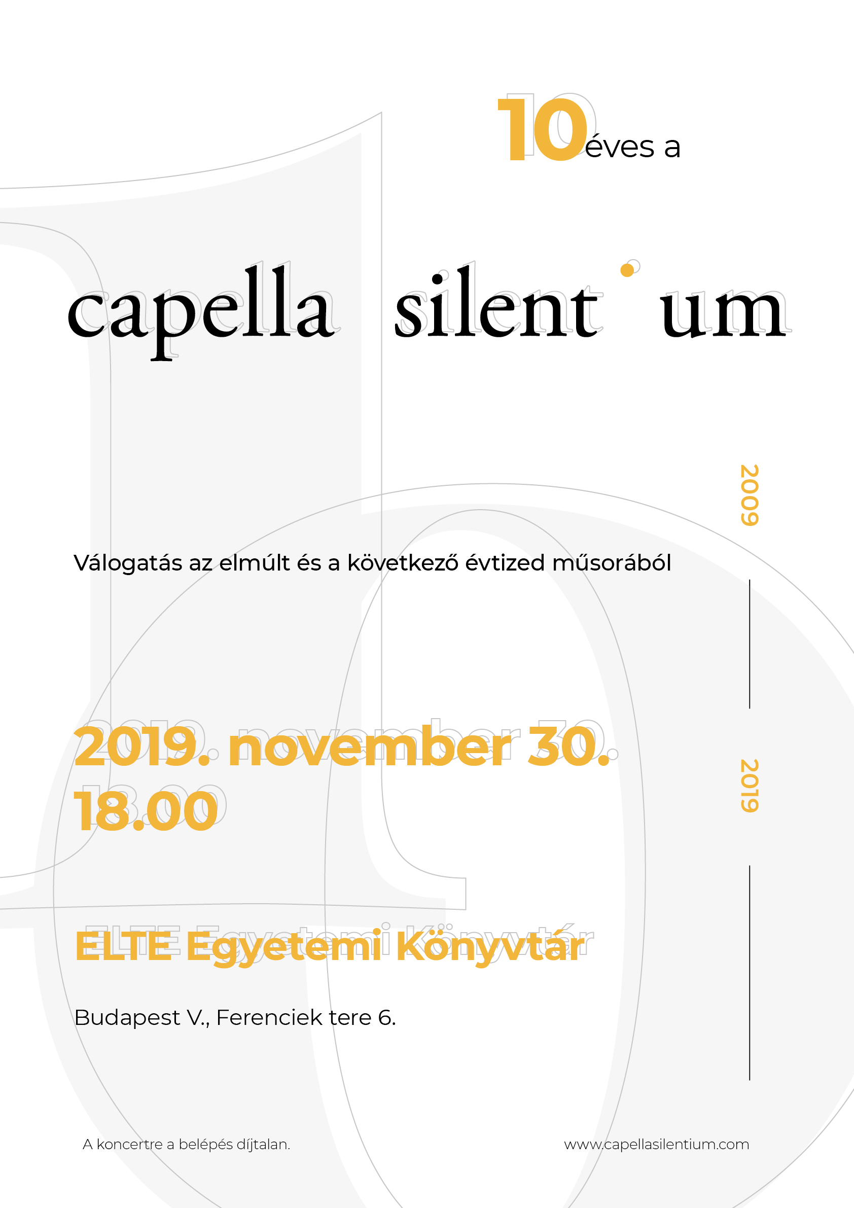 A Capella Silentium fennállásának 10. évfordulója alkalmából jubileumi hangversenyre invitáljuk Önöket. A koncerten többek között Luca Marenzio két kórusművét is hallhatják. A zeneszerzőtől először 2010 júniusában énekeltünk, majd további darabjaiból álló műsorunkat 2012 tavaszán adtuk elő. Johannes Brahms két opusza is felcsendül majd énekegyüttesünk 2013-as tavaszi programjából. A Capella Silentium két korábbi tagja, Szabó Barna és Balogh Máté egy-egy kórusművel tisztelt meg bennünket e kerek jubileum alkalmából. Az ünnepi alkalmon az énekegyüttes korábbi tagjai is énekelnek az ELTE Egyetemi Könyvtár és Levéltár dísztermében (Bp. V., Ferenciek tere 6.) 2019. november 30-án, szombaton 18 órakor. A részletes műismertető ide kattintva olvasható.