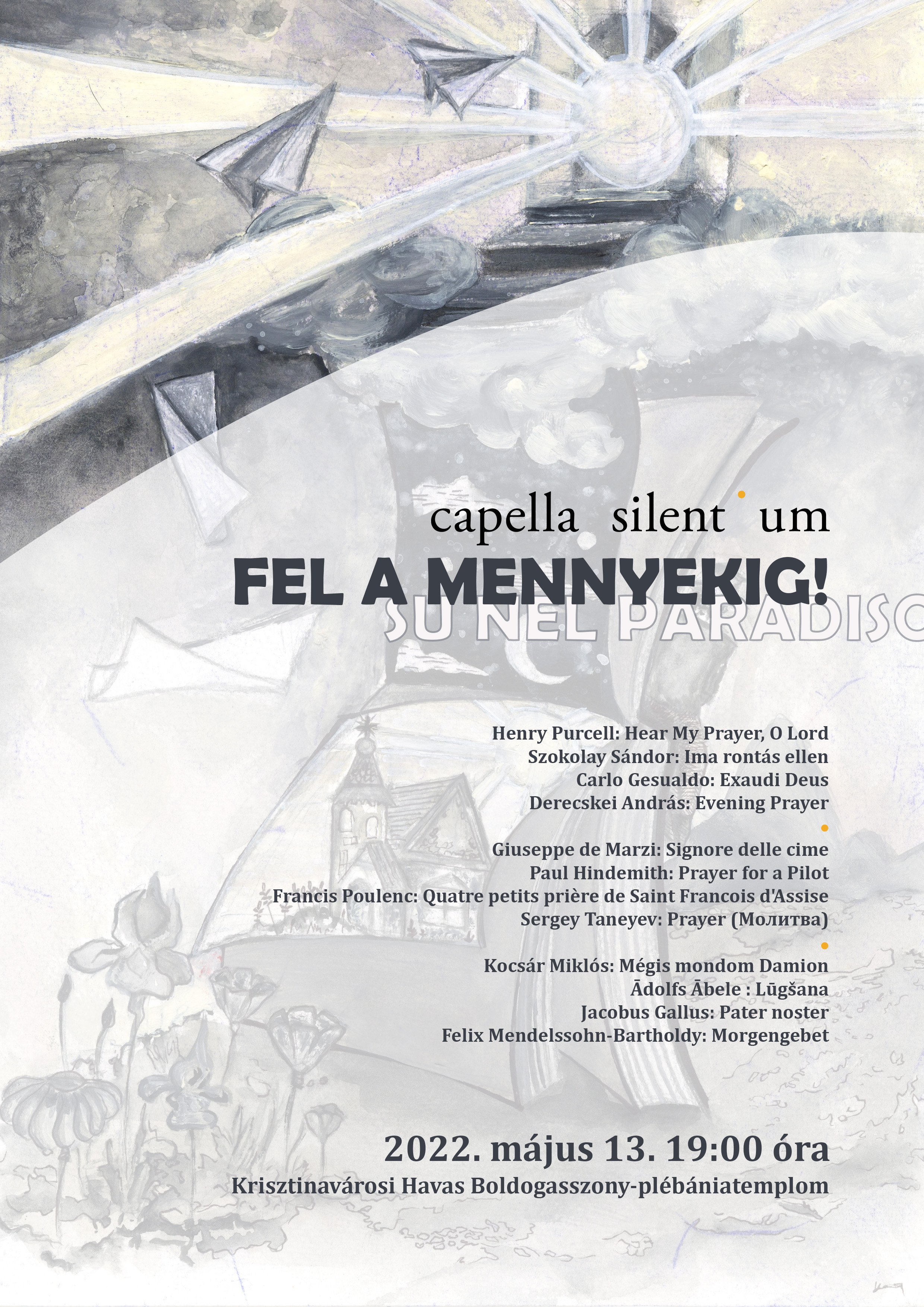A Capella Silentium Fel a mennyekig – Su nel paradiso című koncertjén válogatott imádságokat hallhat a közönség 12 szerző tollából, Purcelltől Szokolayig, Gesualdótól Hindemith-ig, valamint Derecskei András: Evening Prayer című művének ősbemutatóját is előadja az együttes.
