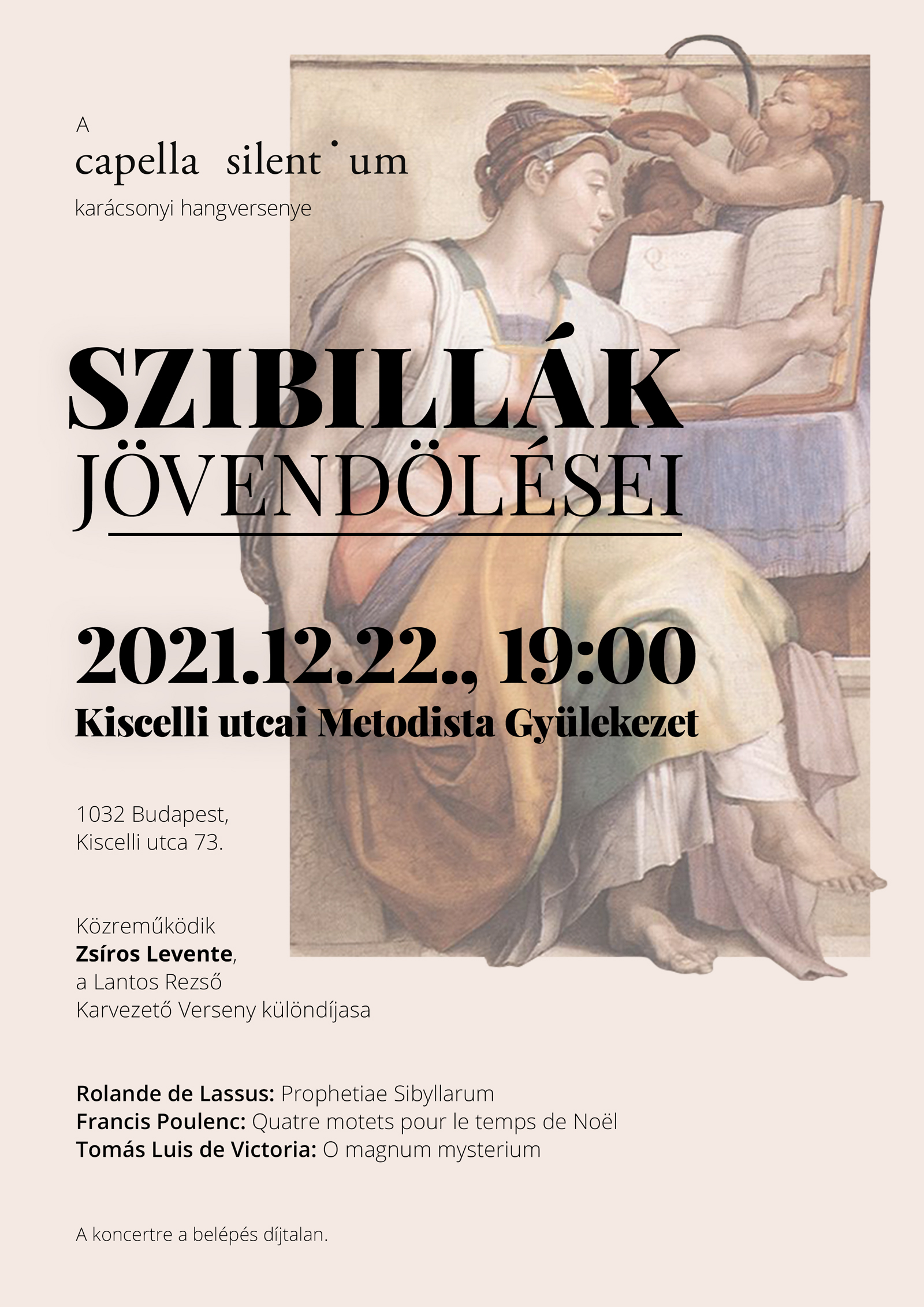Ha visszatekintünk az elmúlt 11 évre, akkor azzal kell szembesülnünk, hogy eddig még nem volt az együttesnek kifejezetten a karácsonyi ünnepkörhöz kötődő, „egész estés” koncertje. Ezt az űrt kívántuk betölteni Rolande de Lassus Prophetiae Sibyllarum című ciklusával, Francis Poulenc Négy karácsonyi motettájával és Tomás Luis de Victoria O magnum mysteriumával. A Kiscelli utcai Metodista Gyülekezetben (Budapest III., Kiscelli utca 73.) adott hangversenyünkön Zsíros Levente, a Lantos Rezső Karvezető Verseny különdíjasa is megtisztelt minket vezényletével.